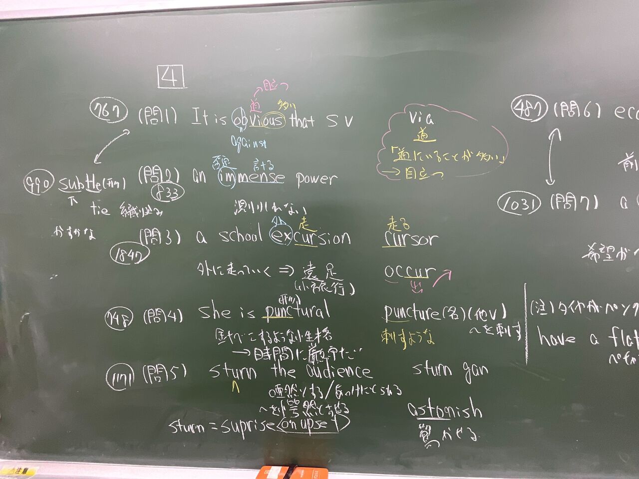 基礎英文読解講座[授業風景] 2024年06月02日 12:17 [基礎英文読解講座]ー授業風景ー<単語編> 授業内に単語の講義があります.学力のない教師がやりがちのことですが,闇雲に単語テストなどで,意味のない暗記を強いることは意味がないと考えます.基礎英文読解の授業では場合によって,単語の内容を時間をかけて語源まで遡り,コロケーションを指摘しつつ説明しています.板書の一部 「授業風景」カテゴリの最新記事 < 前の記事次の記事 > コメント コメントフォーム 名前 コメント 評価する リセット リセット 顔 星 投稿する 情報を記憶